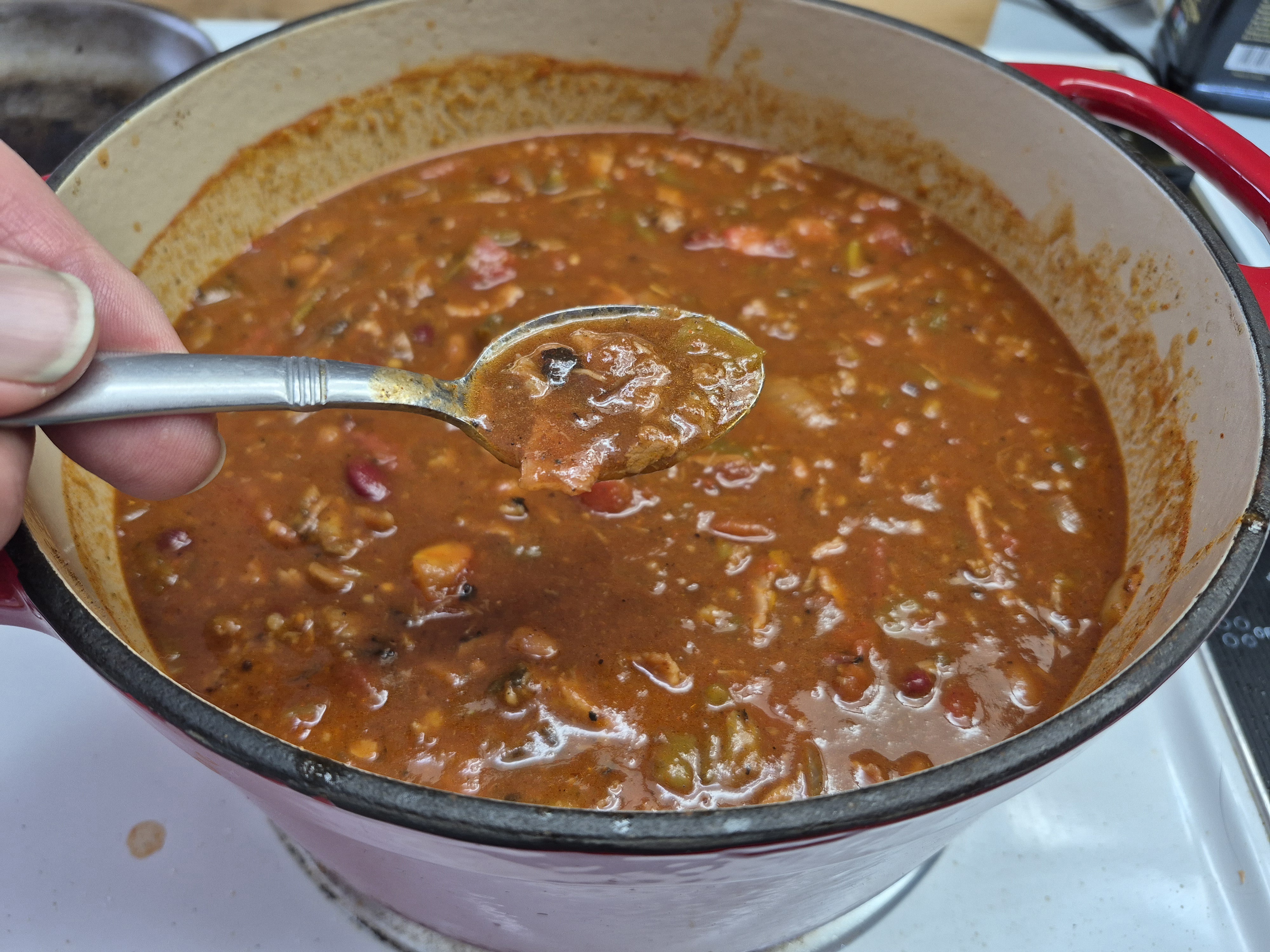 I shredded last night's pot roast, threw in some onions, bacon, sausage, beans, fire roasted tomatoes, green chile 🌶️ 🌶️ and V8. Later we're having chili on this cold winter day.