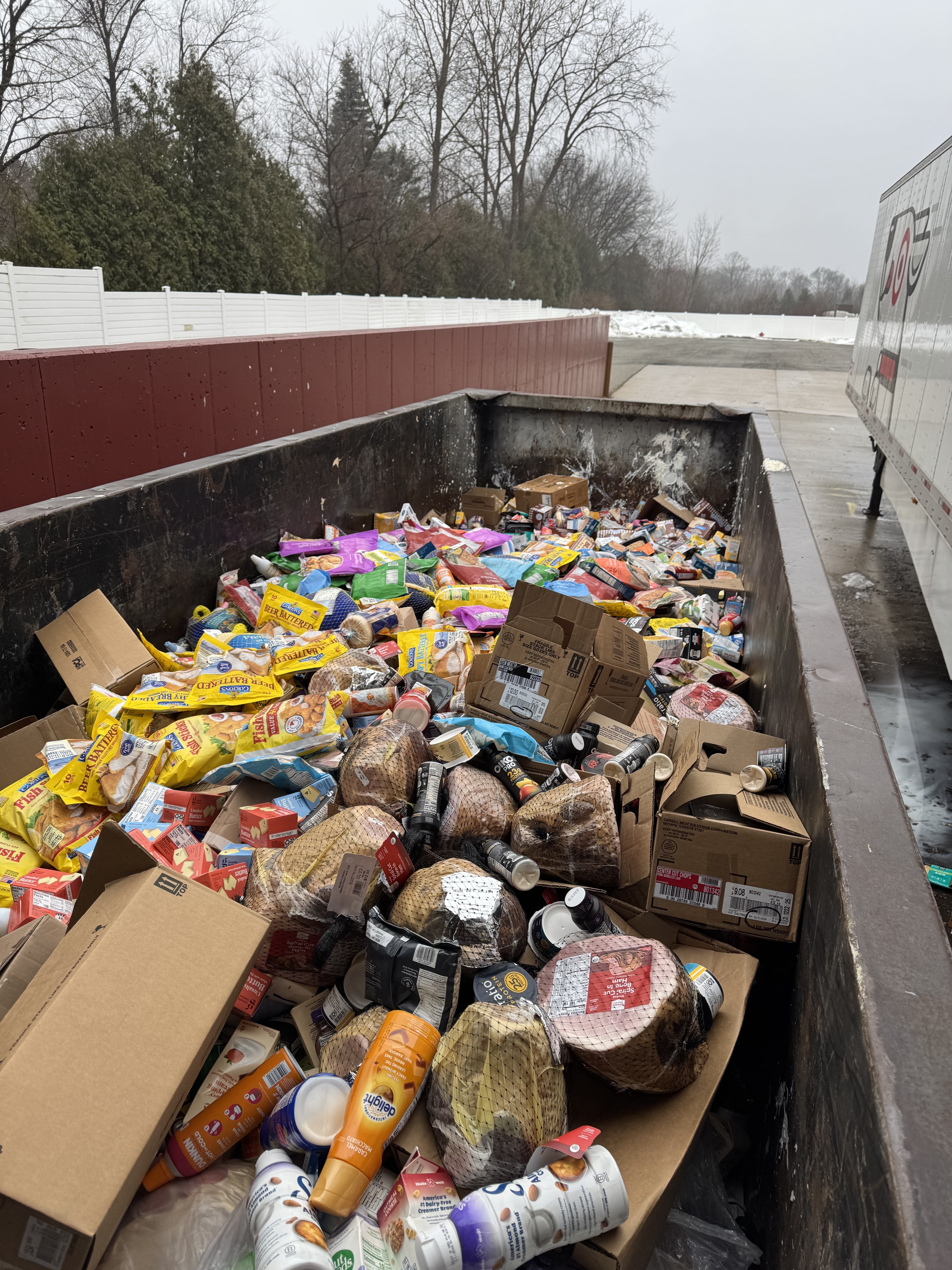 Power went out at the Target I work at last night. They decide that rather than have generators we just damage out all the cooler/freezer food. So today we got to do that and tossed it into this dumpster. It’s more cost-effective for Target to toss the food then to run generators or donate to charity. Good thing that it’s not warm today because that would’ve been a really stinky job.