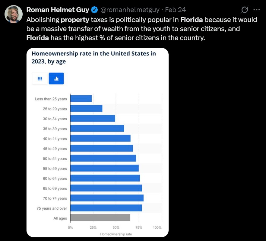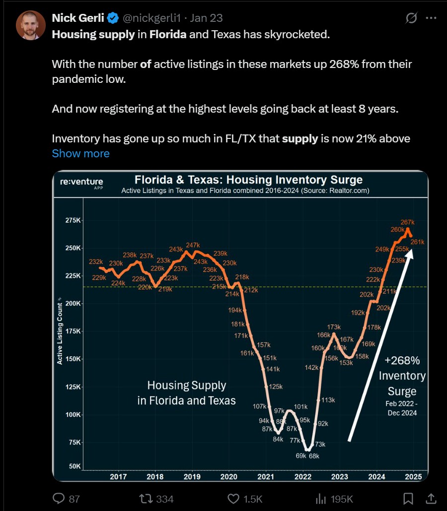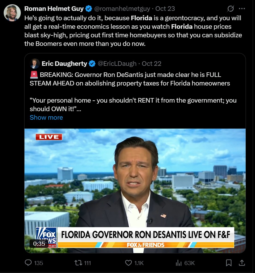 So is Florida experiencing a housing shortage, or a supply glut where they keep building new homes while the demand is falling off a cliff? Because it can't be both, there cannot be too many undervalued homes for investors, but not enough homes for young people and it's all the fault of those boomers miserly hanging onto the homes they spent 30 making payments on