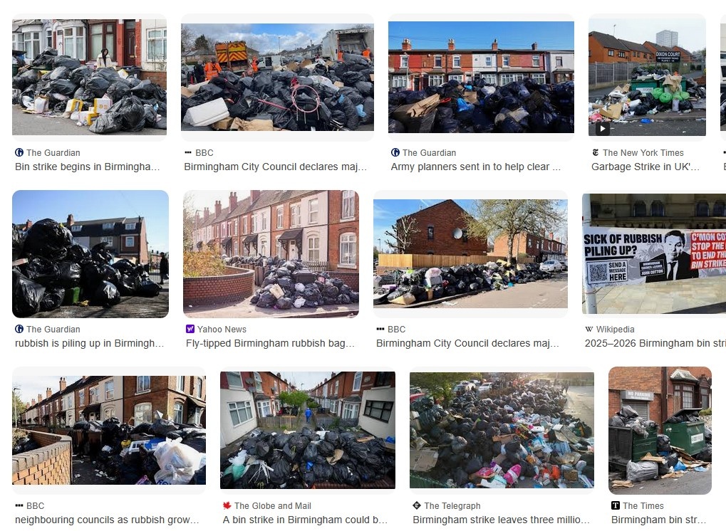 I hadnt realized that there has been a garbage strike in Birmingham and trash hasn't been collected in a year.