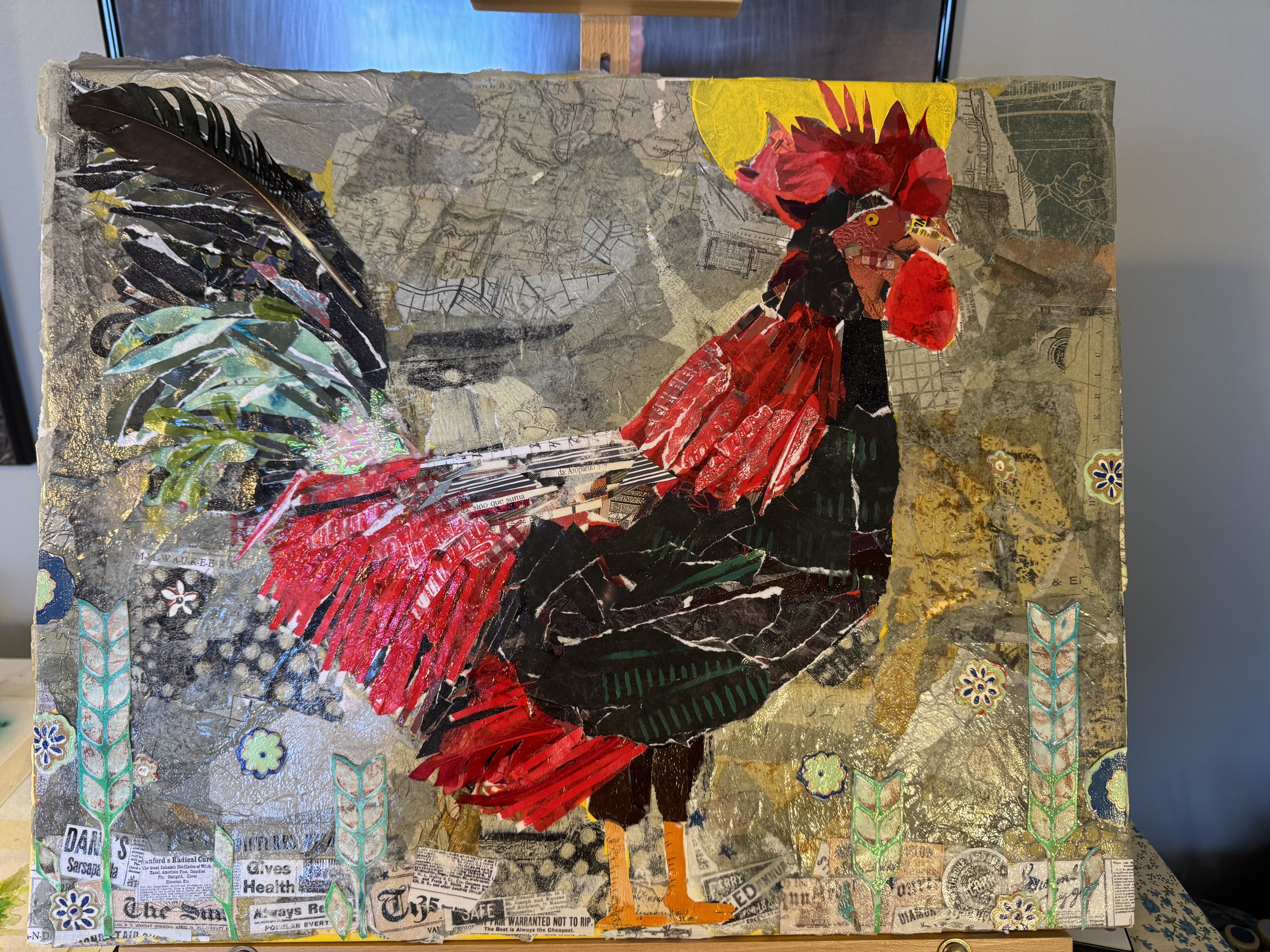 I have been wanting to do a series of roosters for a while now. No clue why. But the first is almost done. This is a mixed media collage. There will be a painting and then a fabric collage. The inspiration is vintage French posters