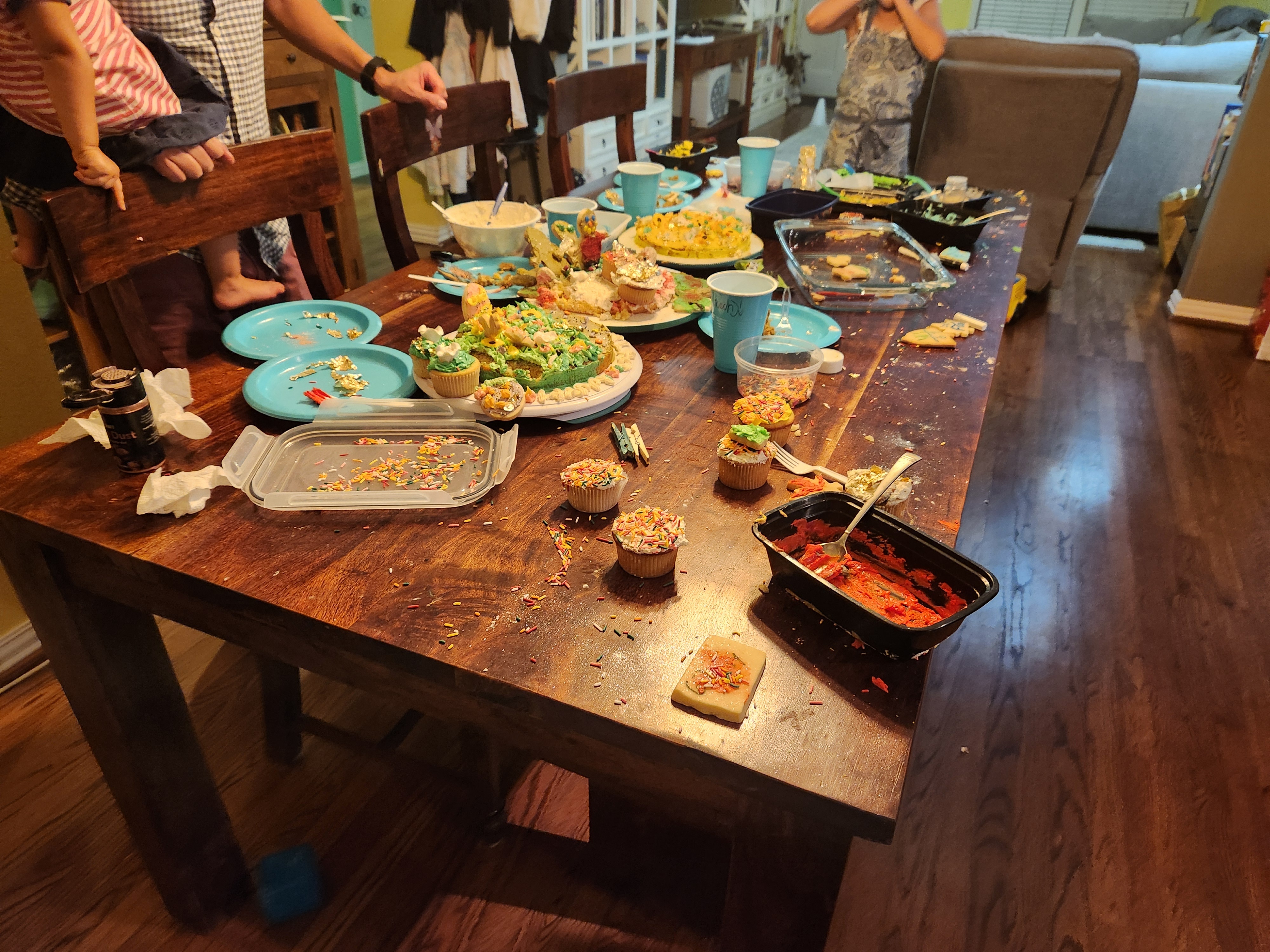 I baked 2.5 dozen cupcakes, ~100 cookies, 4 pumpkin rolls (which i made into a campfire birthday cake because boring yellow cake sucks), made 12 different icing colors & types, and sewed 12 aprons for my daughter's birthday party. The girls predictably made a giant mess, and I'm going to be cleaning edible glitter off my furniture for years. Worth it!
