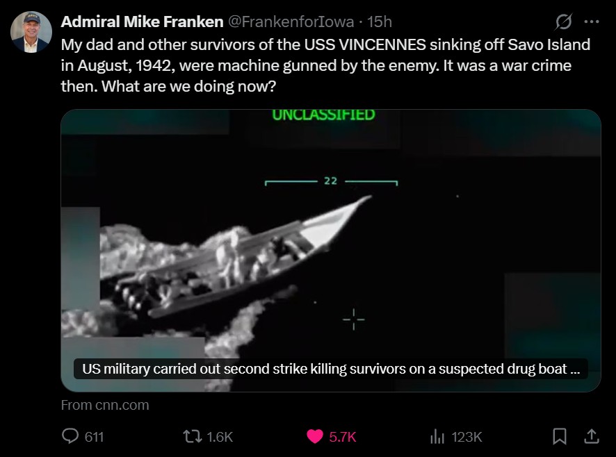 Just because I don't mind strikes on cartel fast boats doesn't mean I'd bat an eyelash if someone actually swung from some gallows over this. The Navy's not there to ensure anyone's due process rights, but they're not there to gun down survivors like fish in a barrel and send all those kids home with those nightmares, either
