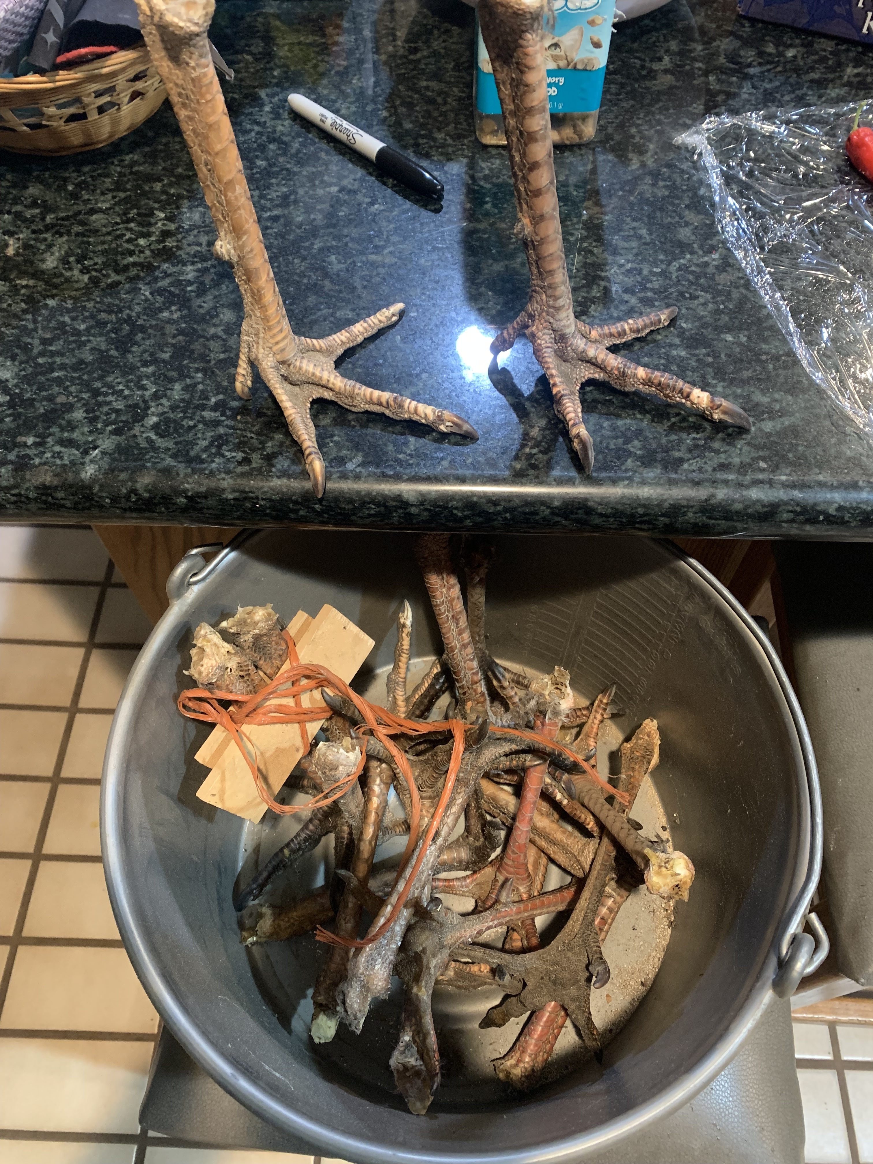 I scored a bucket of turkey feet at an estate sale today! They are all carefully dried so they will stand on their own.